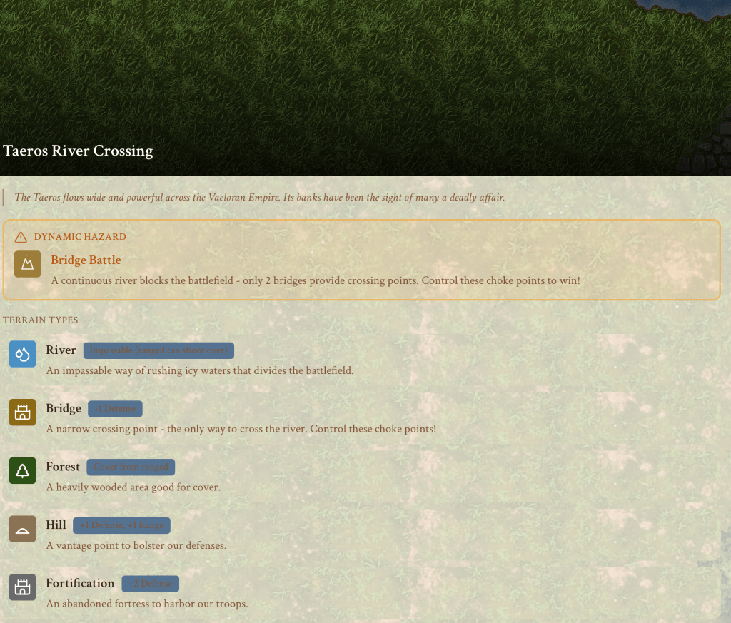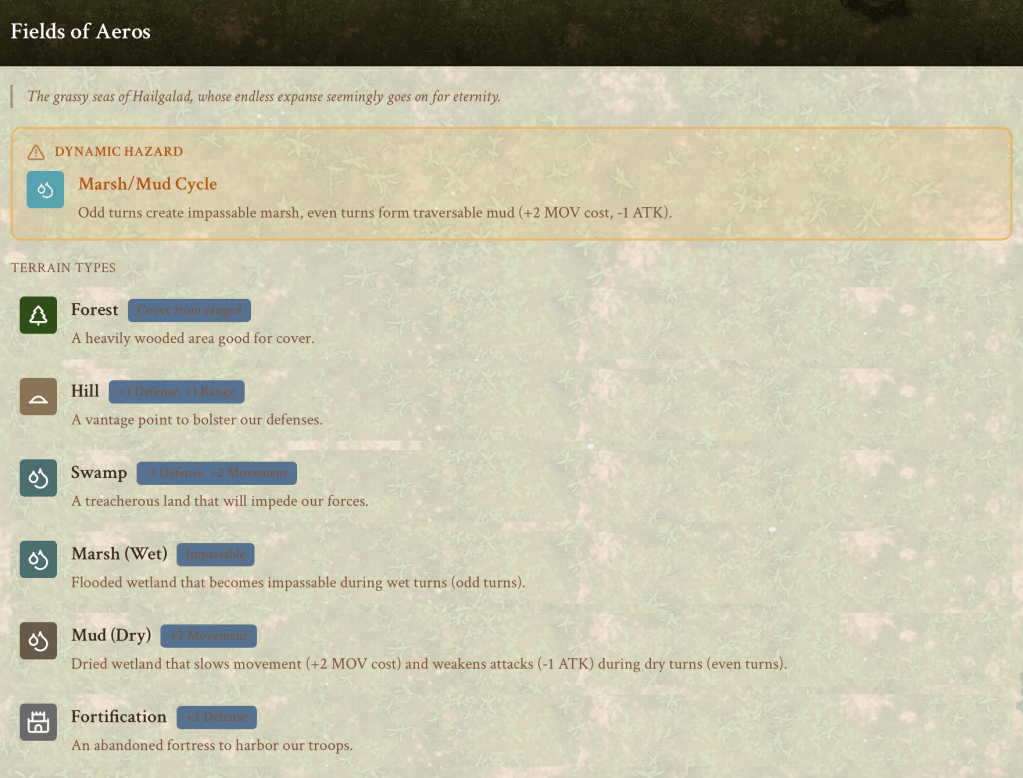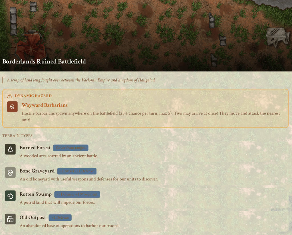 The borderlands are constantly under contention between Vaelor and Hailgalad. These battlefields are filled with old weapons caches, swamps, and even forgotten companies of units. These armies no longer fight for any banner but their own.