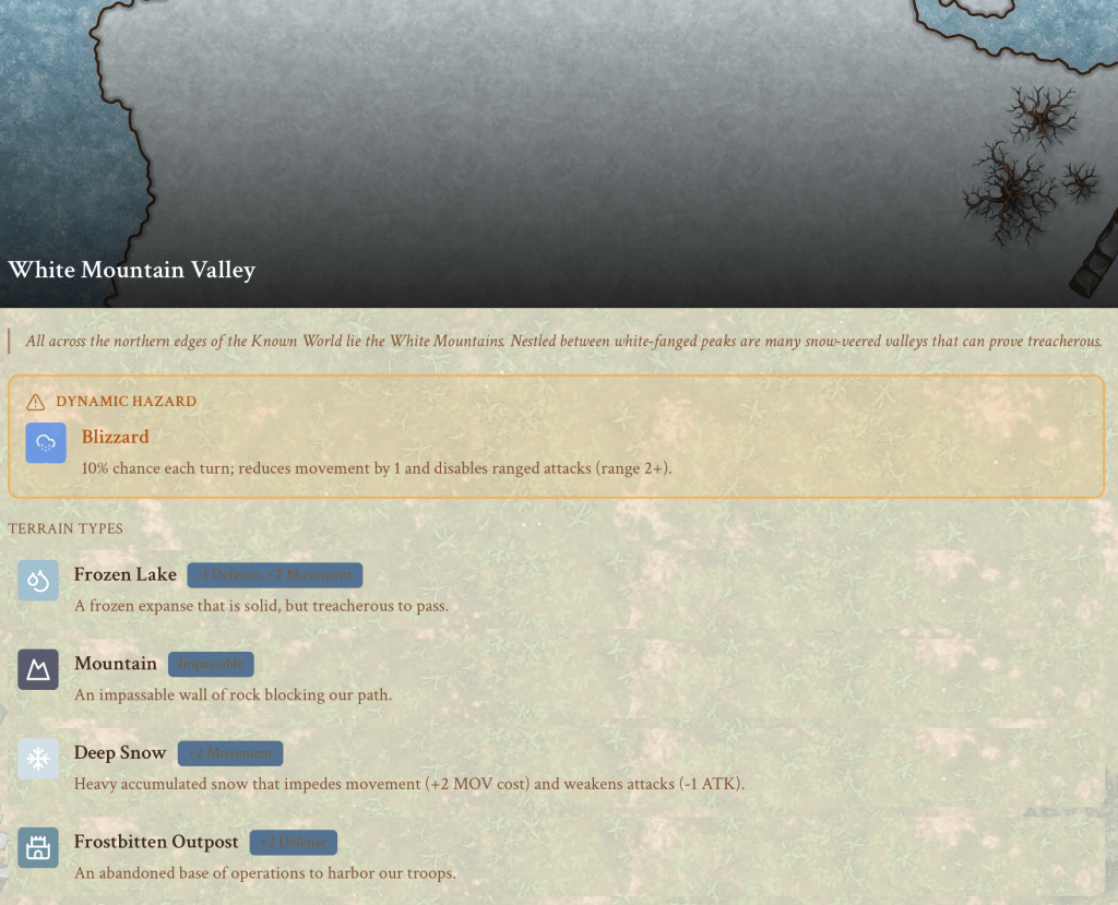 The White Mountains are a vast tundra home to the Northfolk. These lands are covered in snow drifts, frozen lakes, and mountains.