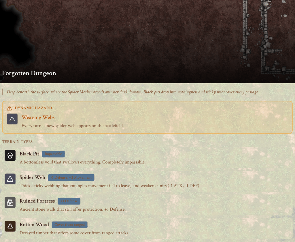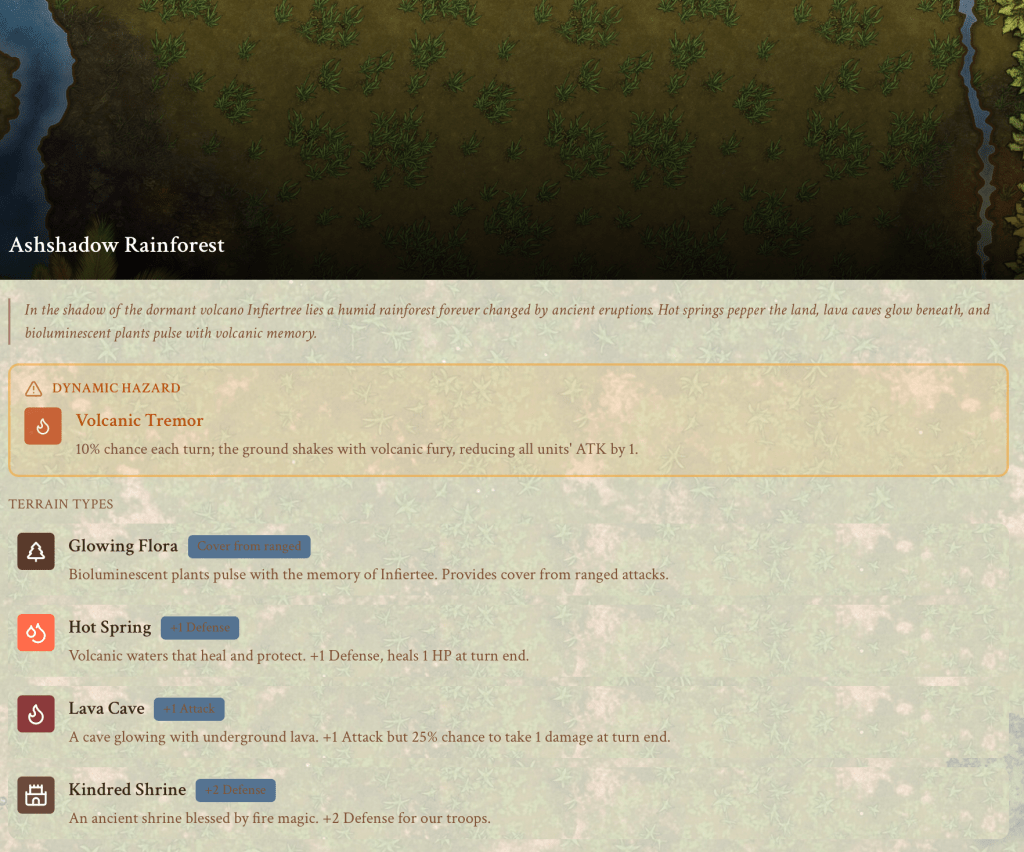 Lava Caves are useful terrains to boost your troops at a potential cost to their health. Tremors constantly shake the land, breaking up formations and attacks on the battlefield. Hold fast and keep your units in order if you are to survive.